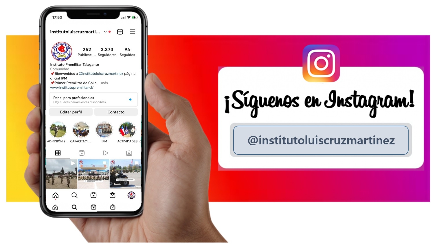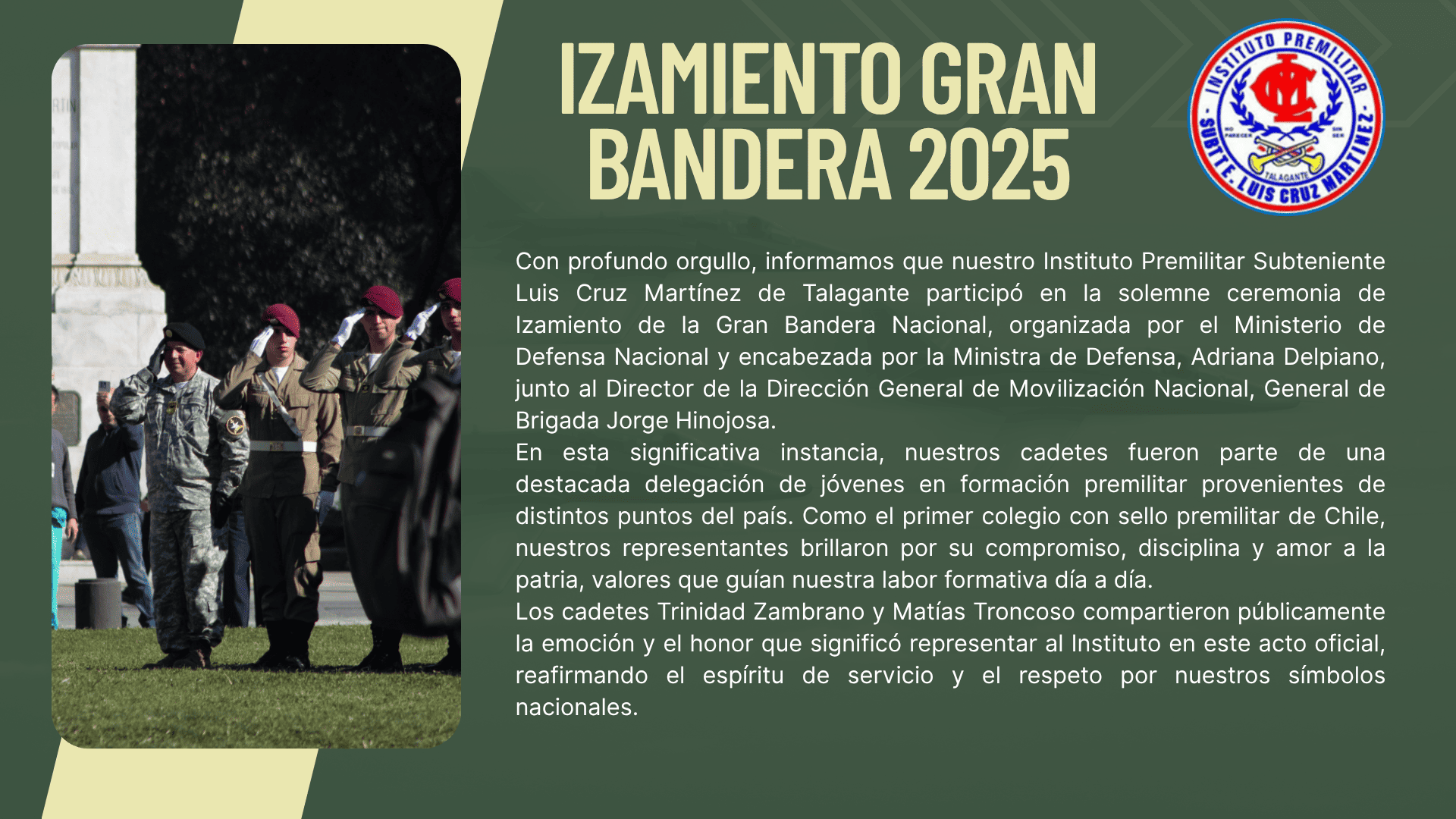 En el Instituto Premilitar Subteniente Luis Cruz Martínez, trabajamos junto a las familias para formar en nuestros cadetes valores fundamentales y disciplina. Gracias a ese esfuerzo compartido, muchos de ellos hoy están orgullosamente sirviendo en las Fuerzas Armadas, de Orden y Seguridad de Chile, poniendo en práctica todo lo aprendido para servir y aportar al crecimiento de nuestro país.