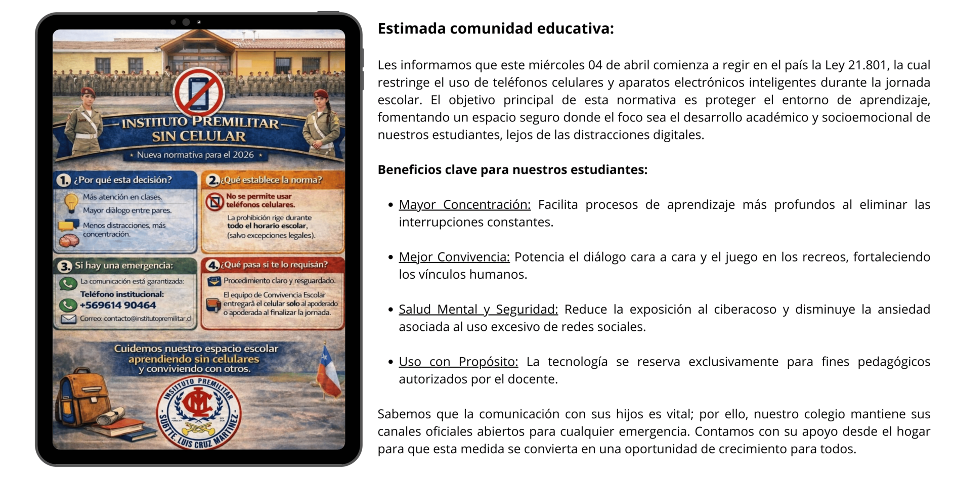 En el Instituto Premilitar Subteniente Luis Cruz Martínez, trabajamos junto a las familias para formar en nuestros cadetes valores fundamentales y disciplina. Gracias a ese esfuerzo compartido, muchos de ellos hoy están orgullosamente sirviendo en las Fuerzas Armadas, de Orden y Seguridad de Chile, poniendo en práctica todo lo aprendido para servir y aportar al crecimiento de nuestro país.